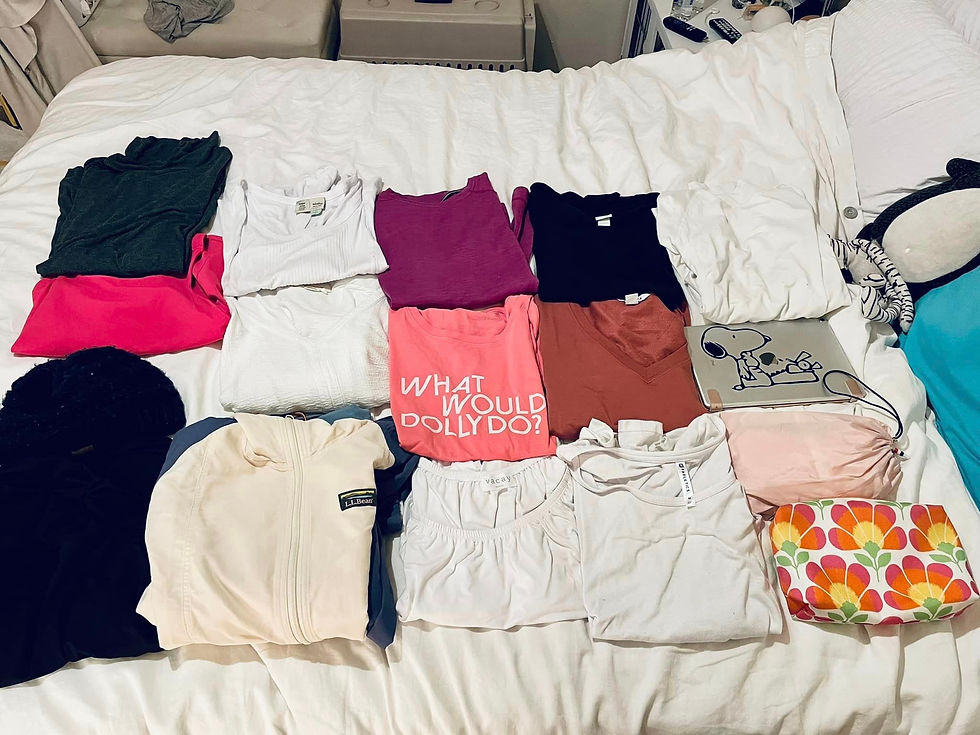 This is; eight long-sleeved shirts. three short-sleeved shirts, two jackets, a wool hat, an iPad, toiletries, a zebra & a bear, a bathing suit, and a workout top, and I had extra room at the top and sides, so one could draw the conclusion if I took out three tops, I could put pants instead.